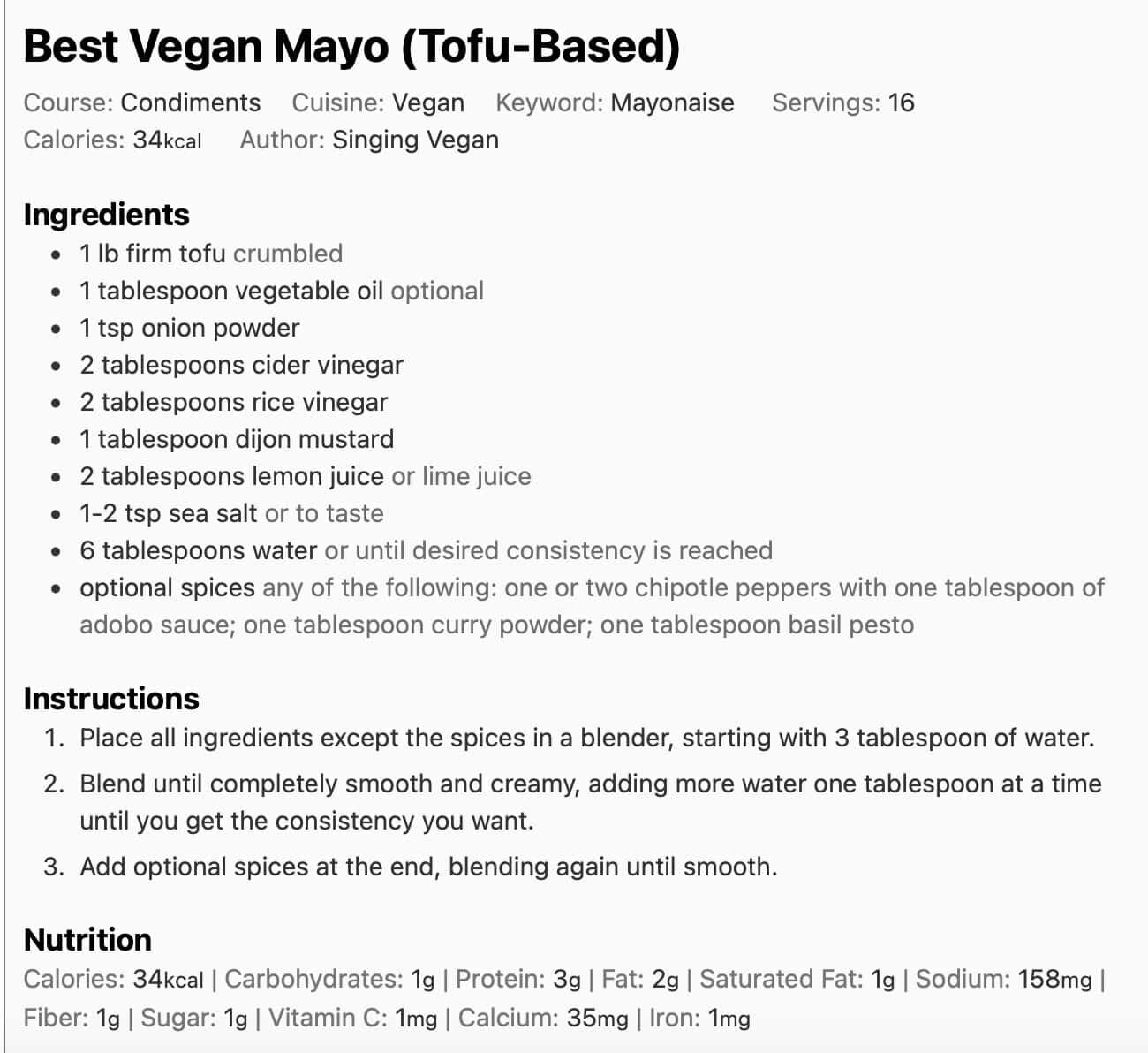 I experimented with a lot of recipes, including some using the traditional method: slowly pouring oil into a running blender with lemon or vinegar to make an emulsion. None of them captured the essence of mayo the way this tofu-based version does. Not only is this version easier, it is far lower in fat than the oil-based recipes. This recipe does use one tablespoon of oil, which gives it a more authentic mayonnaise texture; feel free to omit it if you don’t want added oil.