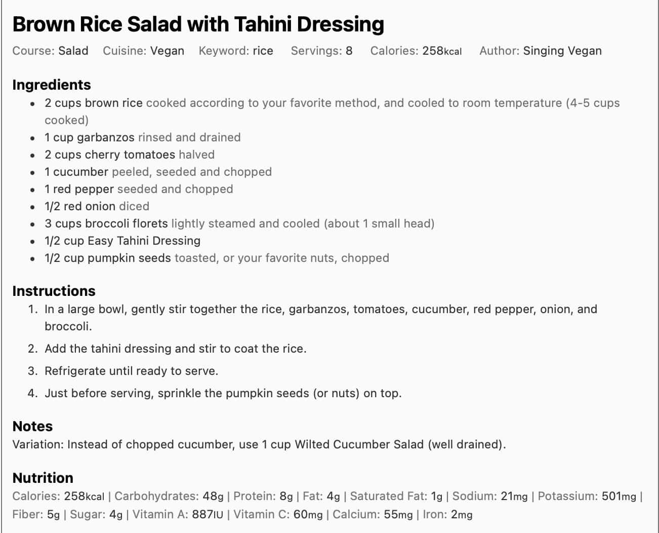 Presto, this Brown Rice Salad was born. It has most of the ingredients I put into my quinoa salad, but I jazzed it up with some of my favorite tahini dressing and toasted pumpkin seeds. The result is a dish that is layered with flavors and oh-so-satisfying.