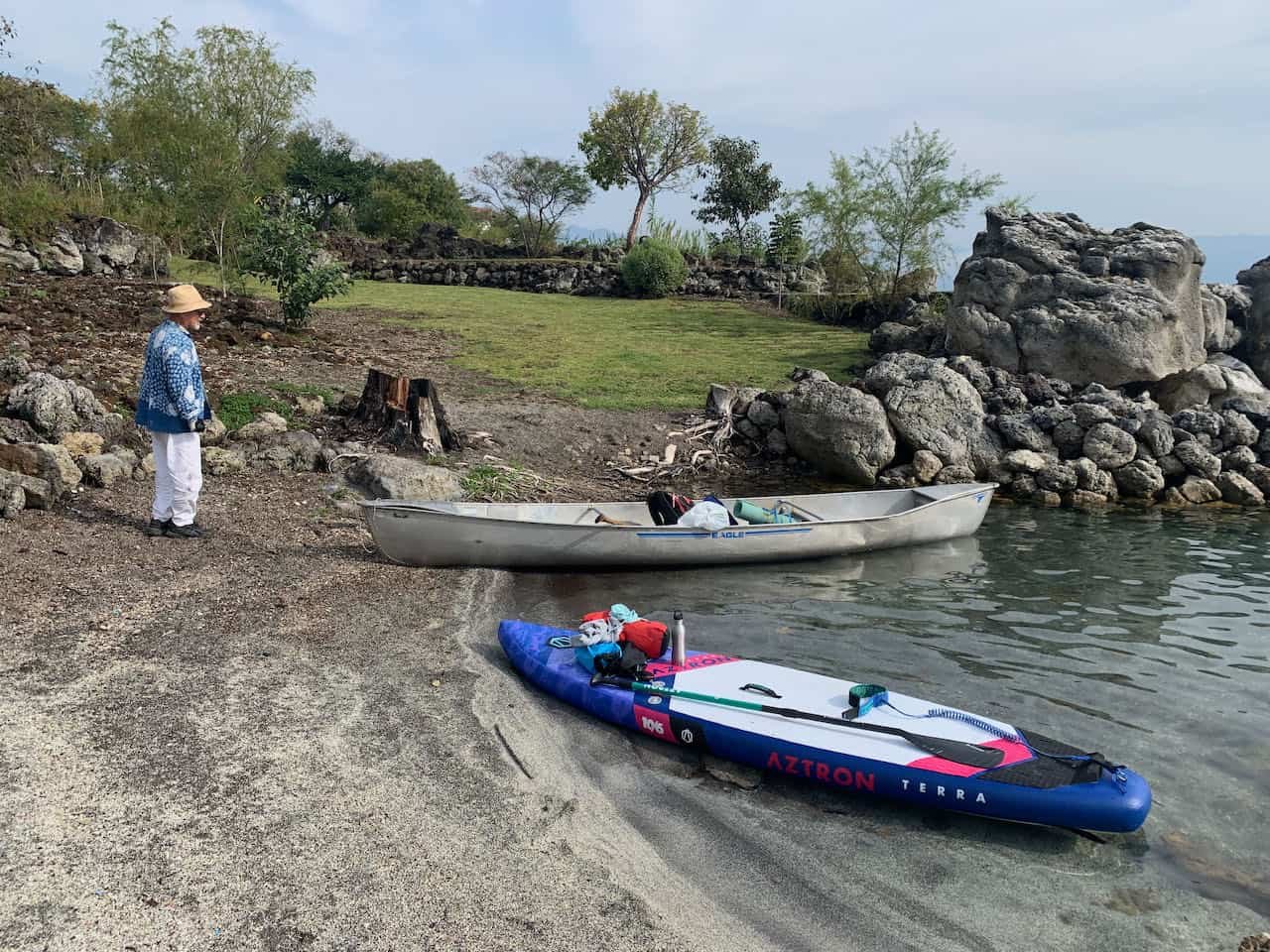 I know a few people who have done the circumnavigation, but I’ve only seen one article about someone doing it on a paddle board. Mark circumnavigated in the canoe in 2018 with his son, Kyle. Most people do it in a kayak. Whatever conveyance you use, it is not a trip for novice paddlers. I have been kayaking on Lake Atitlán for 10 years, and have logged hundreds of SUP hours. Mark has been canoeing on the lake for 40 years. We know the wind and weather patterns, and we understand how quickly the weather can change. If you don’t know the lake well or if you’re a novice paddler, do not try to circumnavigate the lake on your own!