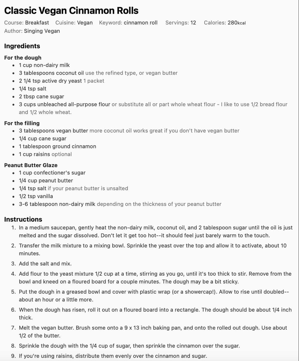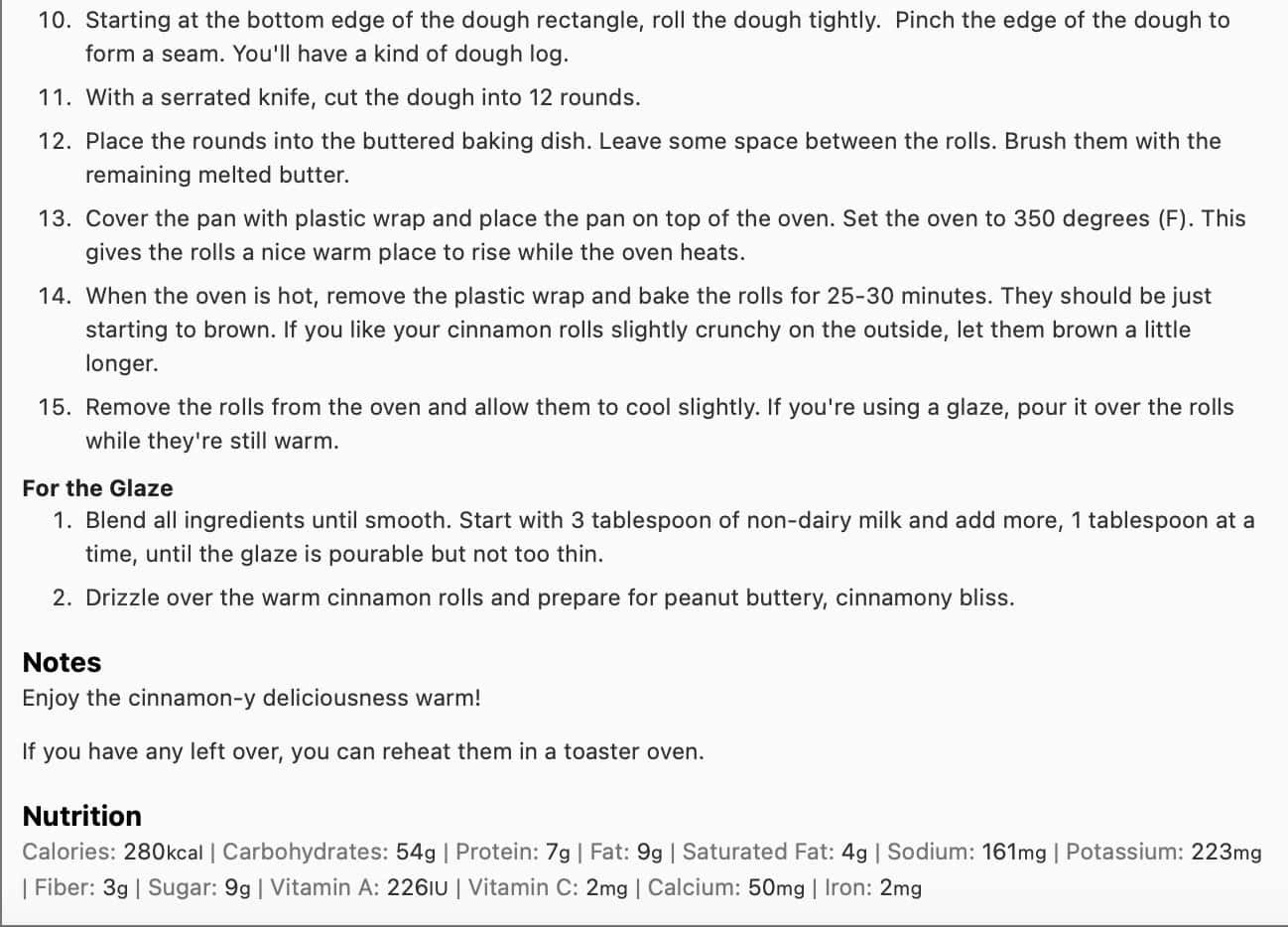 These are wonderful with a cream cheese frosting, but we can’t get vegan cream cheese here and I rarely think far enough ahead to make it. I used to just make a simple glaze from powdered sugar, non-dairy milk, and a touch of vanilla. Then I discovered the wonders of a peanut butter glaze (below). Yes, peanut butter on cinnamon rolls. You’re welcome.