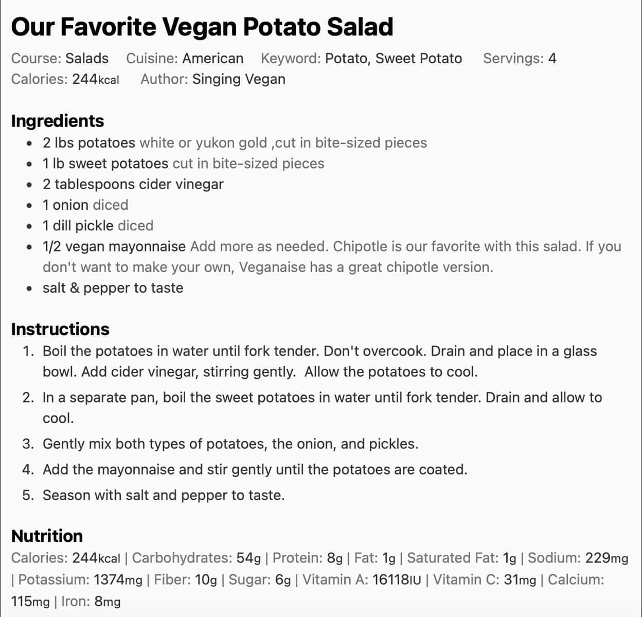I know people who won’t eat potatoes because they fear carbs or cling to old ideas that potatoes are fattening. Spend some time reading Dr. John McDougall’s The Starch Solution then prepare to enjoy this excellent potato salad. Did you know that white potatoes are an excellent source of vitamins B6 and C, potassium, copper, and other minerals?