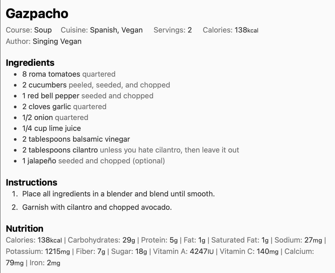 Many years ago I was having lunch at a San Diego restaurant with a friend. Gazpacho was one of the few vegan items on the menu and we both ordered it. My friend is from Spain and gave me his critique of the restaurant’s version; he later showed me how he makes it. I re-created his version from memory, so it may not be quite the same, but everyone who tries it agrees that it’s fabulous.