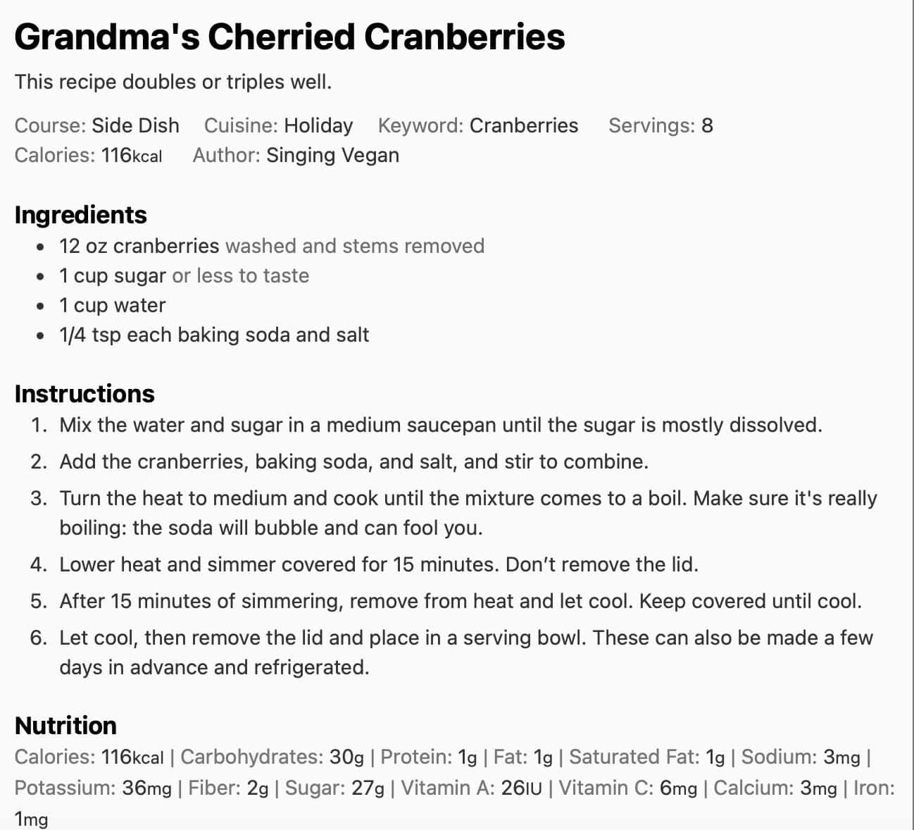 This coming week we celebrate Thanksgiving in the U.S. Though I have lived in Guatemala for the past five Thanksgivings, I still celebrate by making a feast for my family and guests. Though vegan menus are somewhat different from the Thanksgiving meals of my childhood, one dish remains constant: Grandma’s Cherried Cranberries.