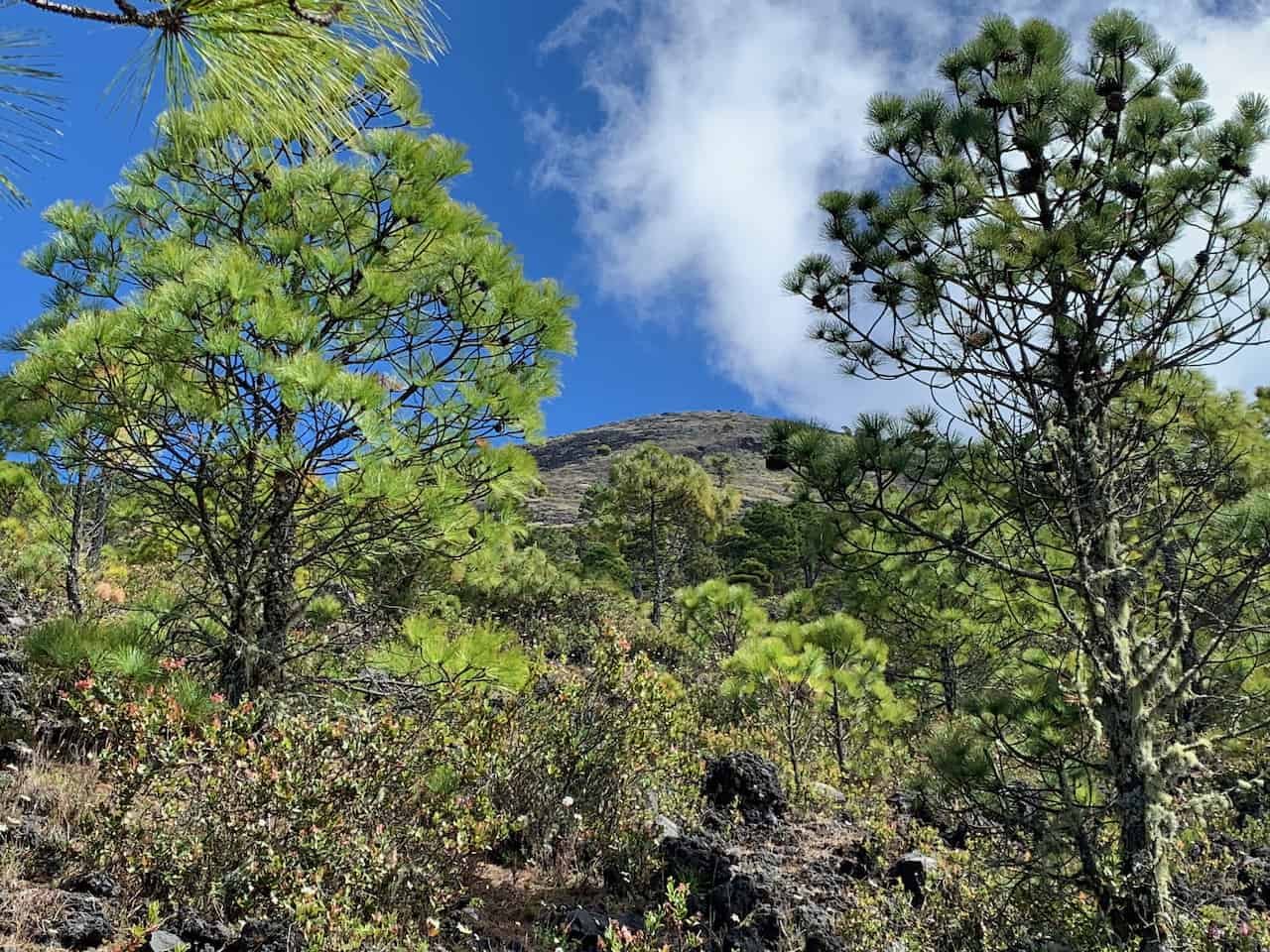 At about 1pm we took our last rest stop in the trees and got our first look at the summit from the trail. The cone of Atitlán is above the tree line and the trail is a path through volcanic rock. It’s the only part of the trail that is exposed, and on a sunny day can be hot and grueling.
