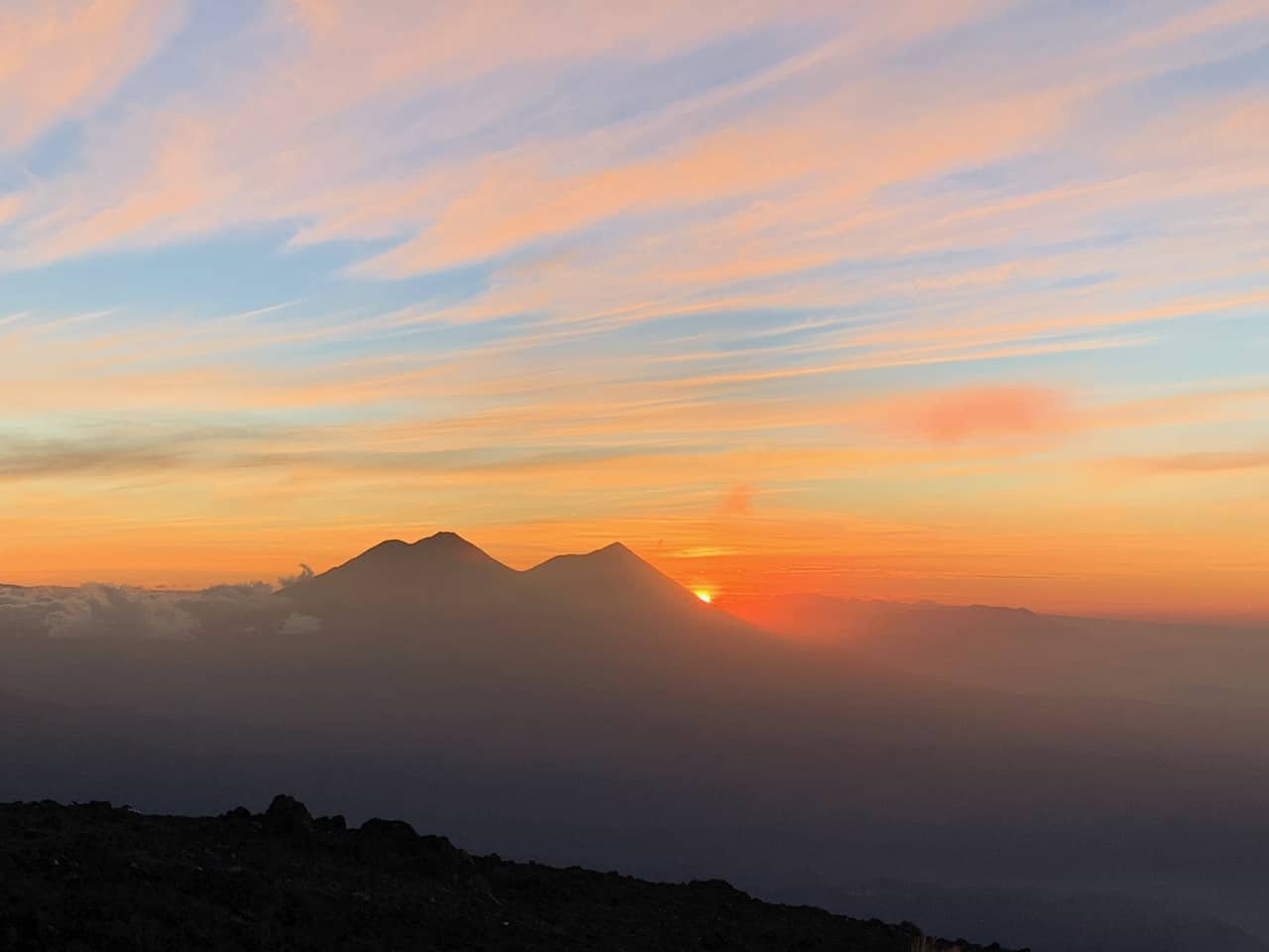 After a windy night, we got up at 5am and awaited the sunrise in a sheltered area: the wind out of the shelter is brutal. We were rewarded with a view of several small eruptions by Fuego volcano and a gorgeous painted sky.