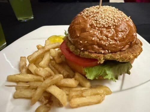 The same chef prepared our dinner at his event location: the best garbanzo burger and fries ever.