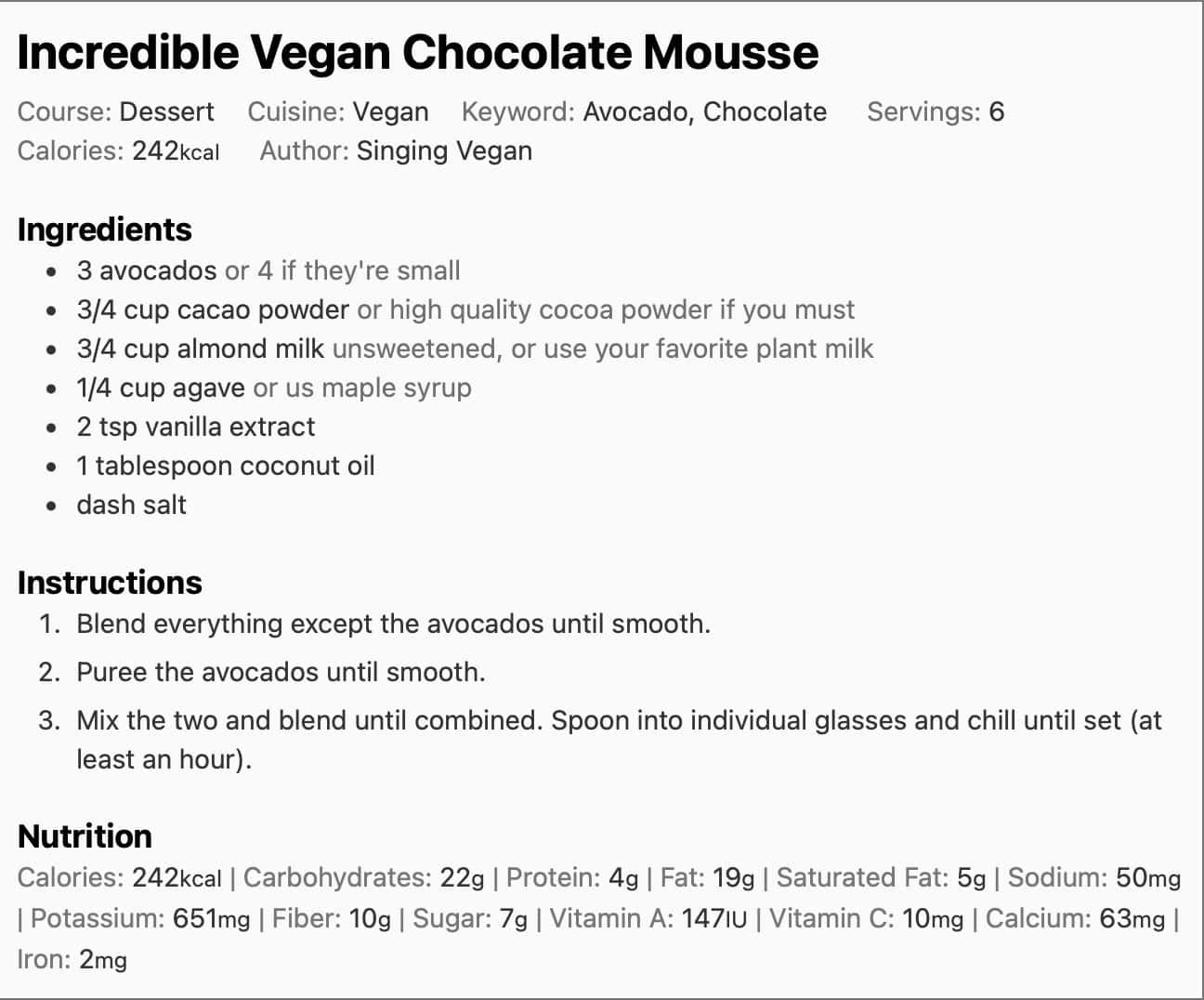 There are endless recipes for this mousse all over the Internet. This is my basic version, but I vary it a bit every time I make it. Try using a different flavored extract (such as almond or peppermint) or layering the mousse with a fruit puree. Make it extra special with a dollop of coconut whipped cream on top. I often garnish the mousse with chopped, toasted almond or macadamia nuts.