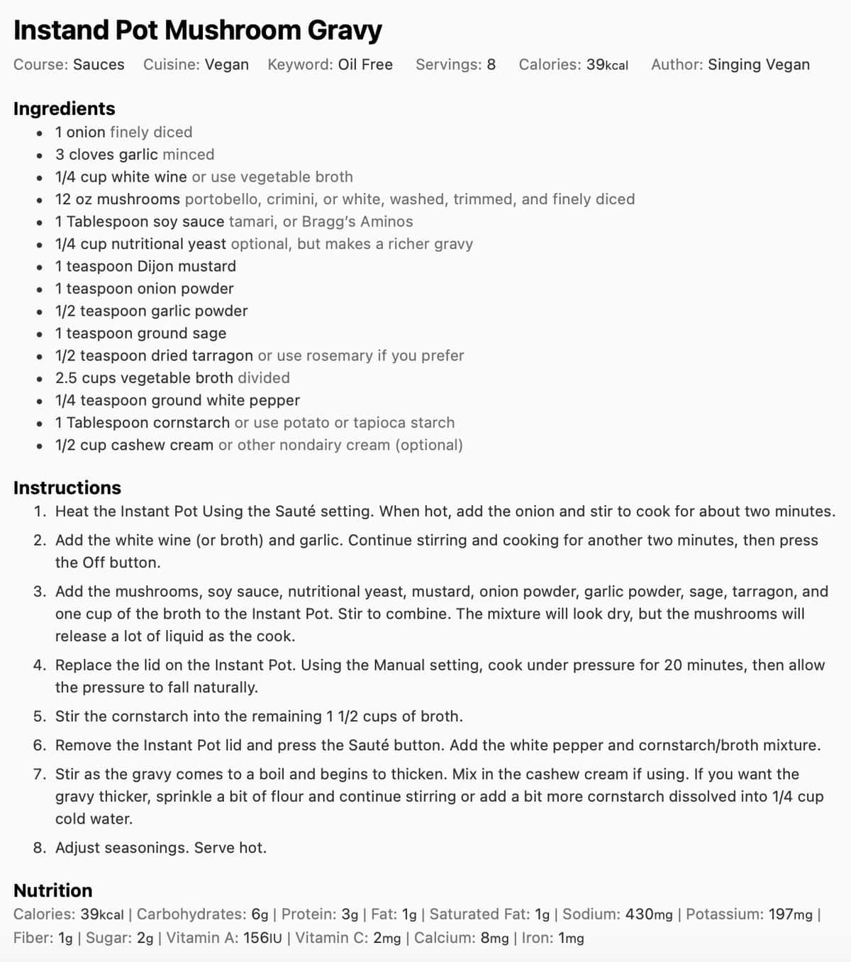 I was asked to bring gravy. I have several nice vegan gravy recipes and decided on a mushroom version. Since it would be a large crowd and I would be bringing it in my Instant Pot, I knew I wanted to make it in the Instant Pot. As fate would have it, this recipe from Vegan Richa showed up in my Facebook feed. I was on the right track.