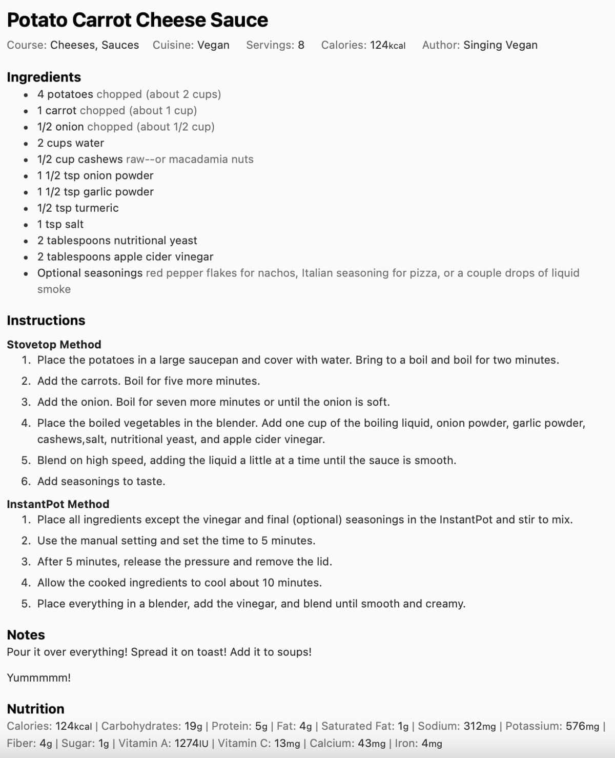 I admit, I resisted jumping on the the potato-carrot-cheese-sauce bandwagon. I’ve tried every kind of homemade cheeze sauce–squash, cauliflower, and the trusty cashew. I’ve made semi-soft almond cheeze and faux brie and smokey cheddar. Some of them are pretty good but, I now have to admit, nothing has the versatility and yumminess of the potato carrot sauce.