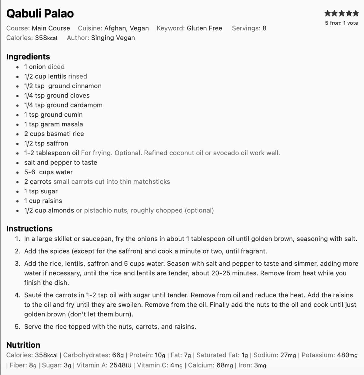 Yum! I’ve always loved Qabuli Palau from foreign student potlucks, and I was so excited to make my own plant-based version! It came out great, maybe a little dry. Next time, I’ll take the rice mixture off the heat while there’s still a little liquid in the pan. The exotic spices are a lovely mixture, and when it’s all eaten with the carrots, raisins, and pistachios, Magic!!!! Looking forward to the leftovers!