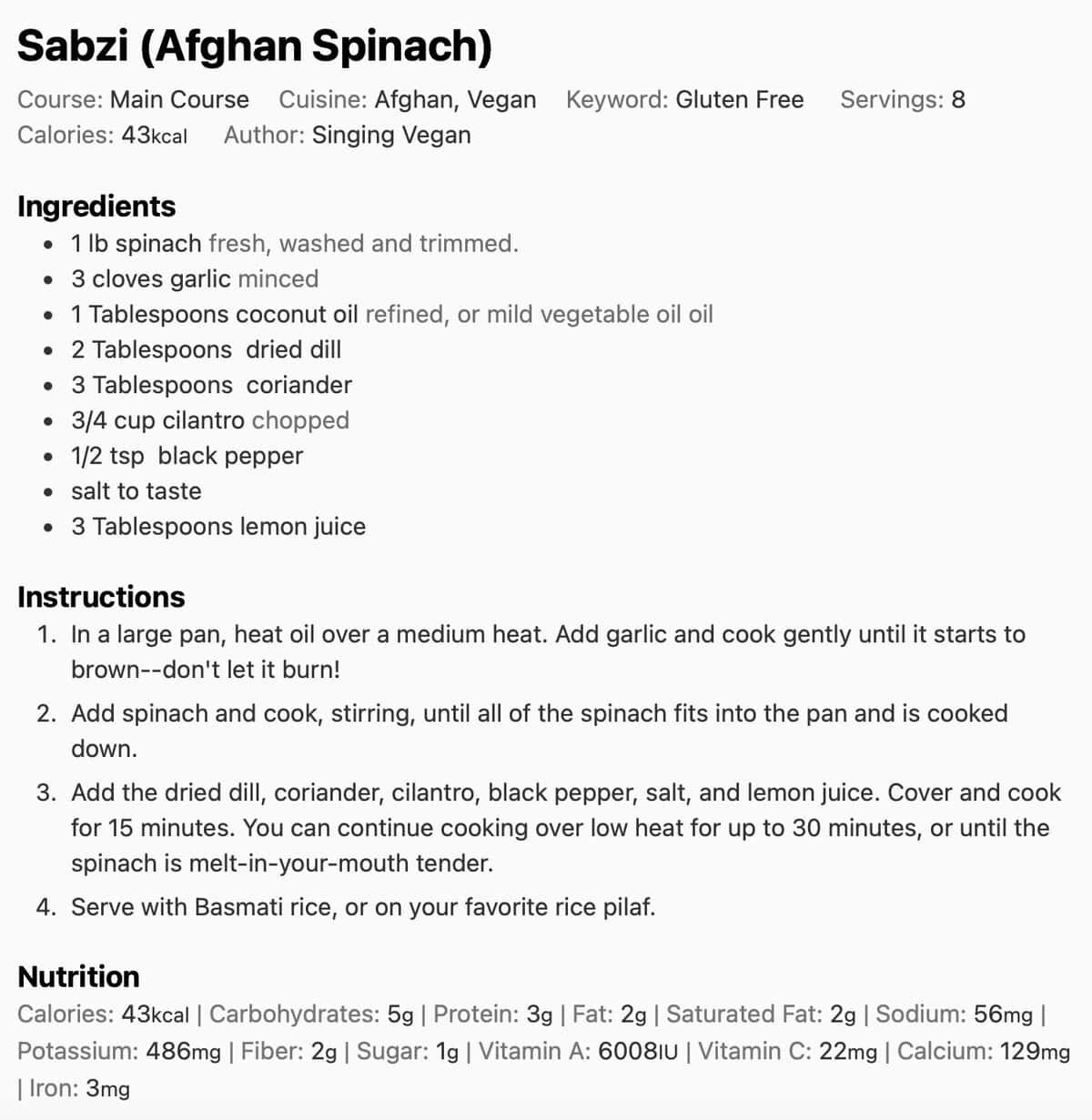 This is a companion post to the Qabuli Palao recipe. While my assignment for my Plant-Based Chef Professional Certification program was a rice and lentil dish, I wanted lots of greens to go with the Qabuli Palao. Sabzi is a popular Afghan stewed spinach dish with bold flavors that are a wonderful match with the Qabuli Palao.