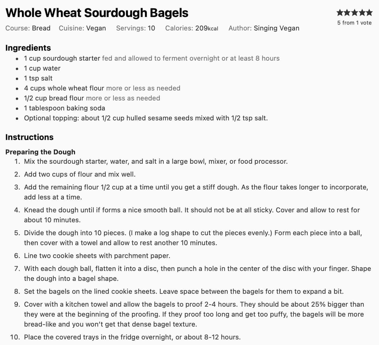 This recipe is for whole wheat sourdough bagels with sesame seeds. If 100% whole wheat is too dense for you, replace two cups of the whole wheat flour with hard white (bread) flour. Bread flour is higher in gluten than all-purpose flour.