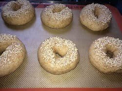 My other favorite bagels are sourdough rye. Simply replace two cups of the whole wheat flour with rye flour. Add about 2 tablespoon of caraway seeds to the dough before you divide it, and omit the sesame seed topping.