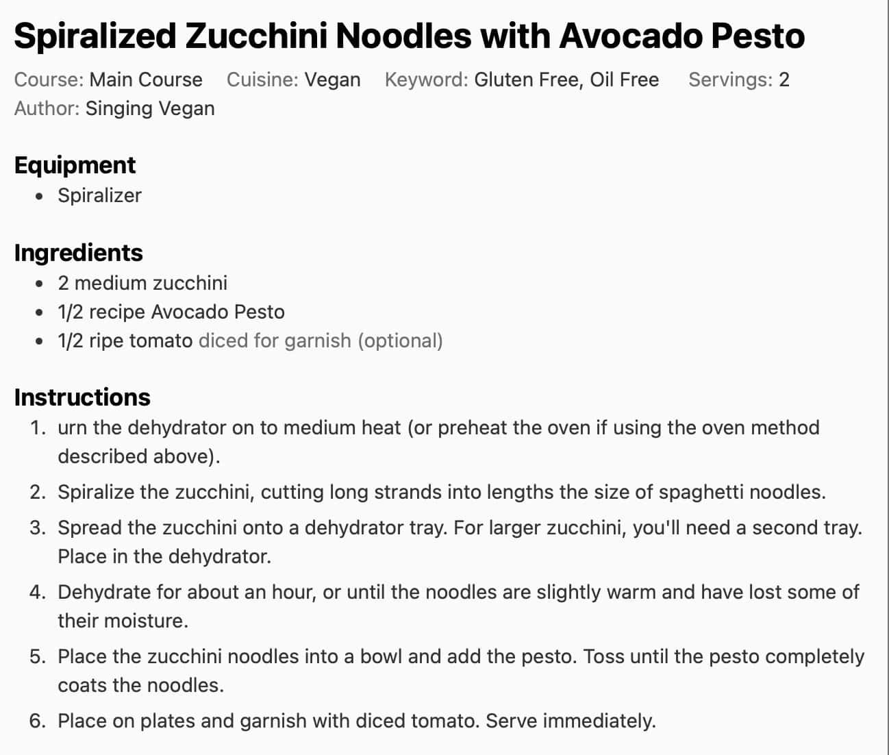 While some recipes call for zucchini noodles to be cooked, I serve them raw. I do, however, like to dehydrate them for about an hour. This process removes some of the zucchini’s moisture, so the noodles don’t release moisture into the sauce and make it runny.