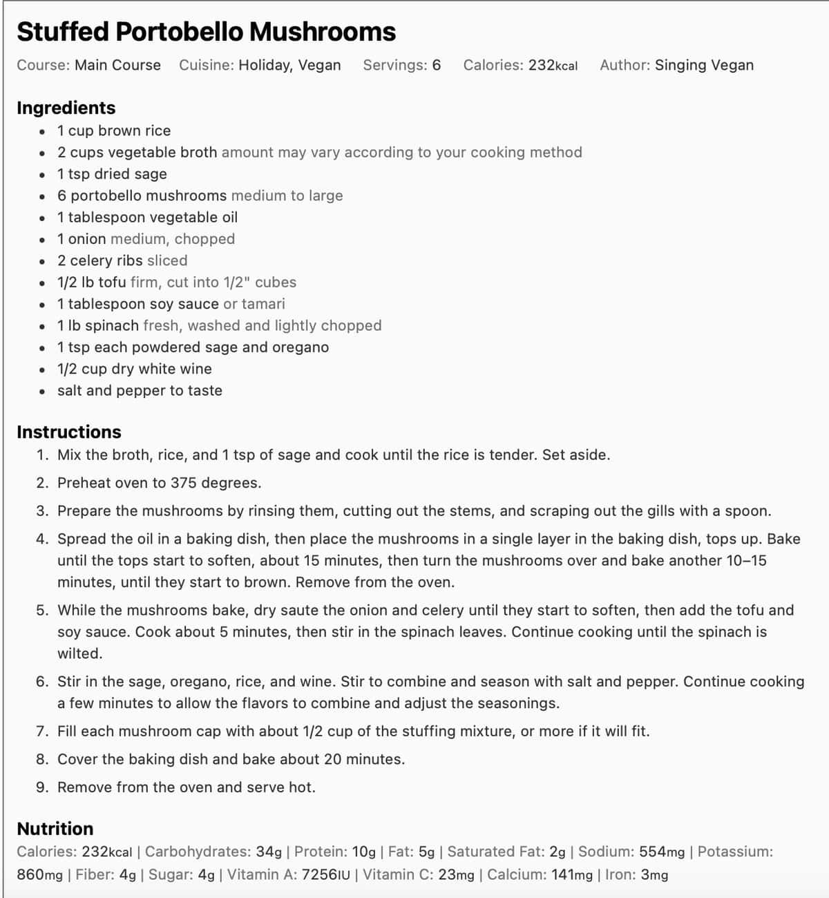 Stuffed portobello mushrooms have been my favorite holiday meal for years. I’ve made them with wheat bread stuffing and cornbread stuffing, with and without nuts, and with and without tofu. I’ve topped them with mushroom sauce and red pepper sauce and gravy and vegan cheese. This year, with little time to cook and tiny kitchen with only a small counter-top oven, I tried something different… and these are now my all-time favorite.