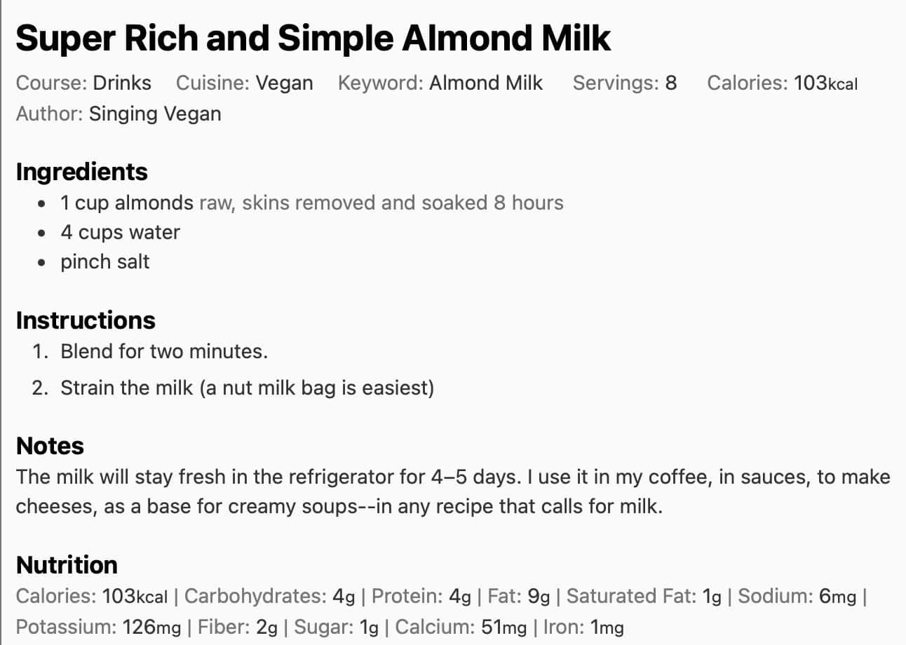 Soaking the almonds at least eight hours makes them nice and soft, so you get a verrry creamy almond milk. Of course, having a high-power blender helps with the creaminess too, but it’s not required.