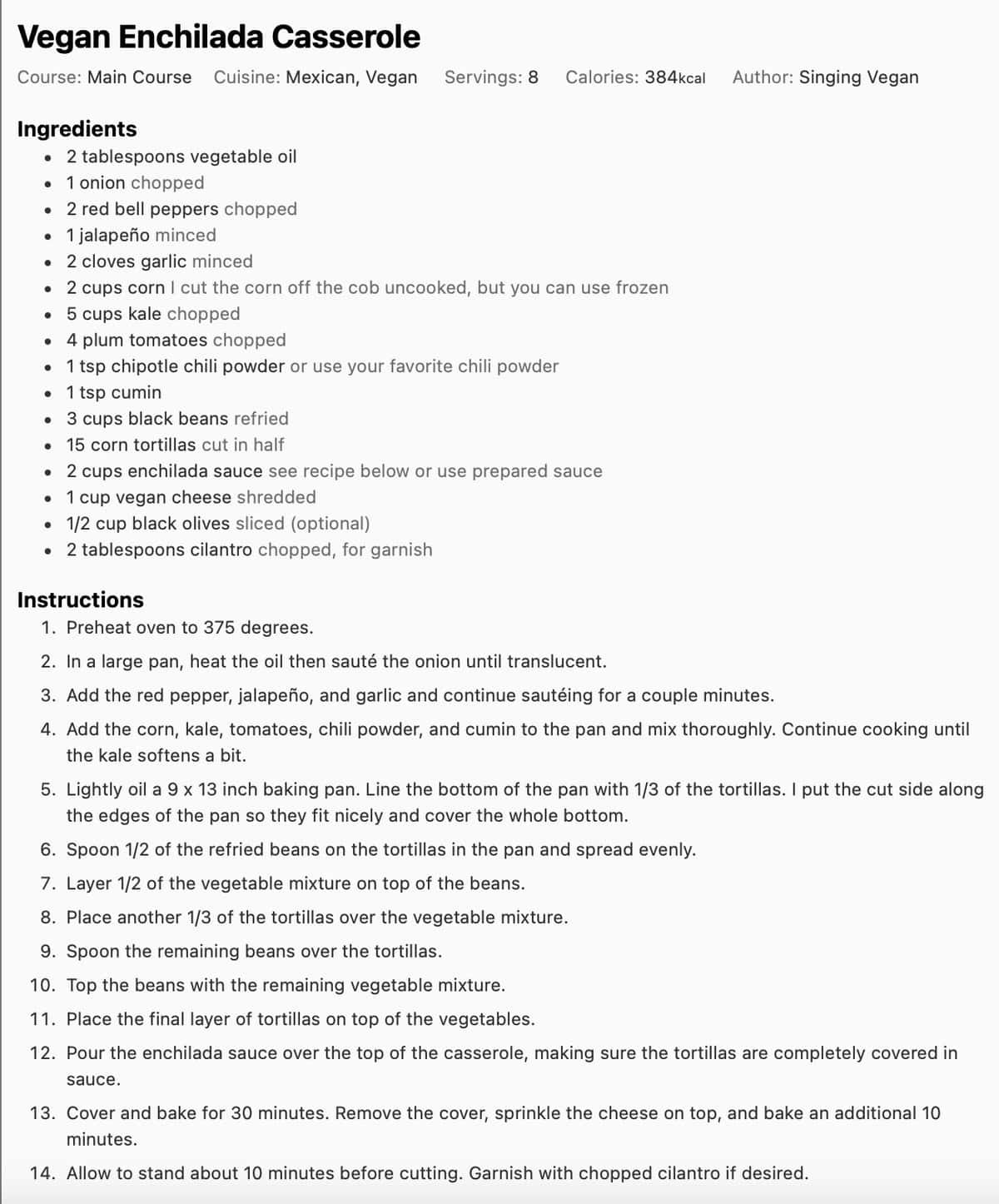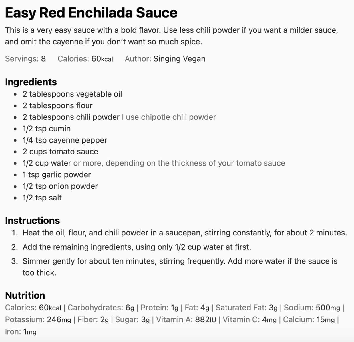 I’d been looking at enchilada casserole recipes for a while, but hadn’t found any that really called to me. So I started playing, and this was the result. Though enchiladas are a Mexican dish, I gave the casserole a Guatemalan twist by using refried black beans, which are a staple here. Most veggie enchilada casserole recipes call for spinach, but I have a garden full of beautiful kale, so that’s what I used. Substitute other greens if kale isn’t your thing. I don’t use any canned products, so I had to do some prep by making the refried black beans. I added a bit of extra liquid so the beans could be spread easily in the pan. This version of the casserole uses a red enchilada sauce recipe I found on about.com and modified slightly (below). This sauce has a very bold flavor. Try the casserole with a green enchilada sauce if you want a lighter flavor. Some roasted green chilis would also be a nice addition.