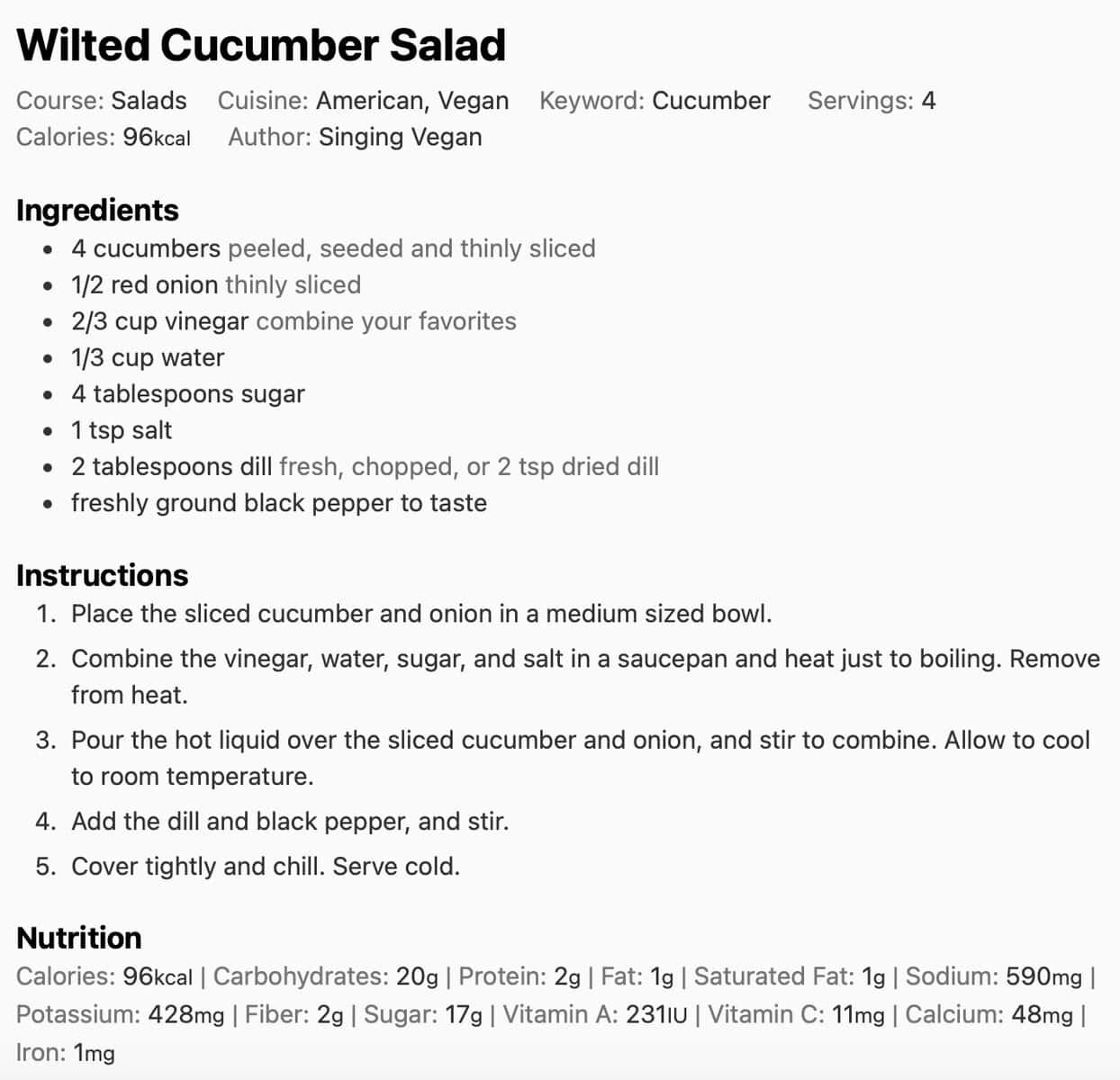 You can make this dish with your favorite combination of vinegars. I use 1/2 high quality cider vinegar (Braggs will do) and 1/2 rice vinegar. I don’t like to use a vinegar that’s too strongly flavored, or it will overpower the natural goodness of the cucumber.